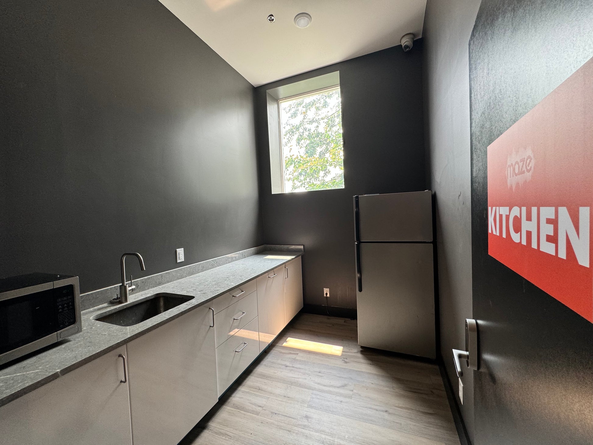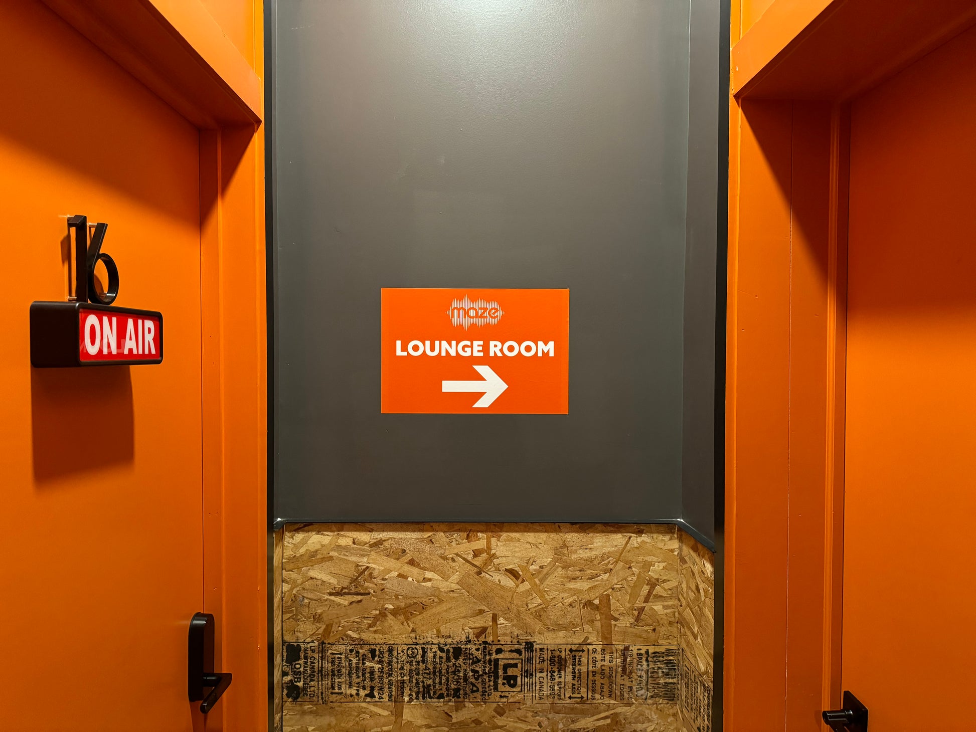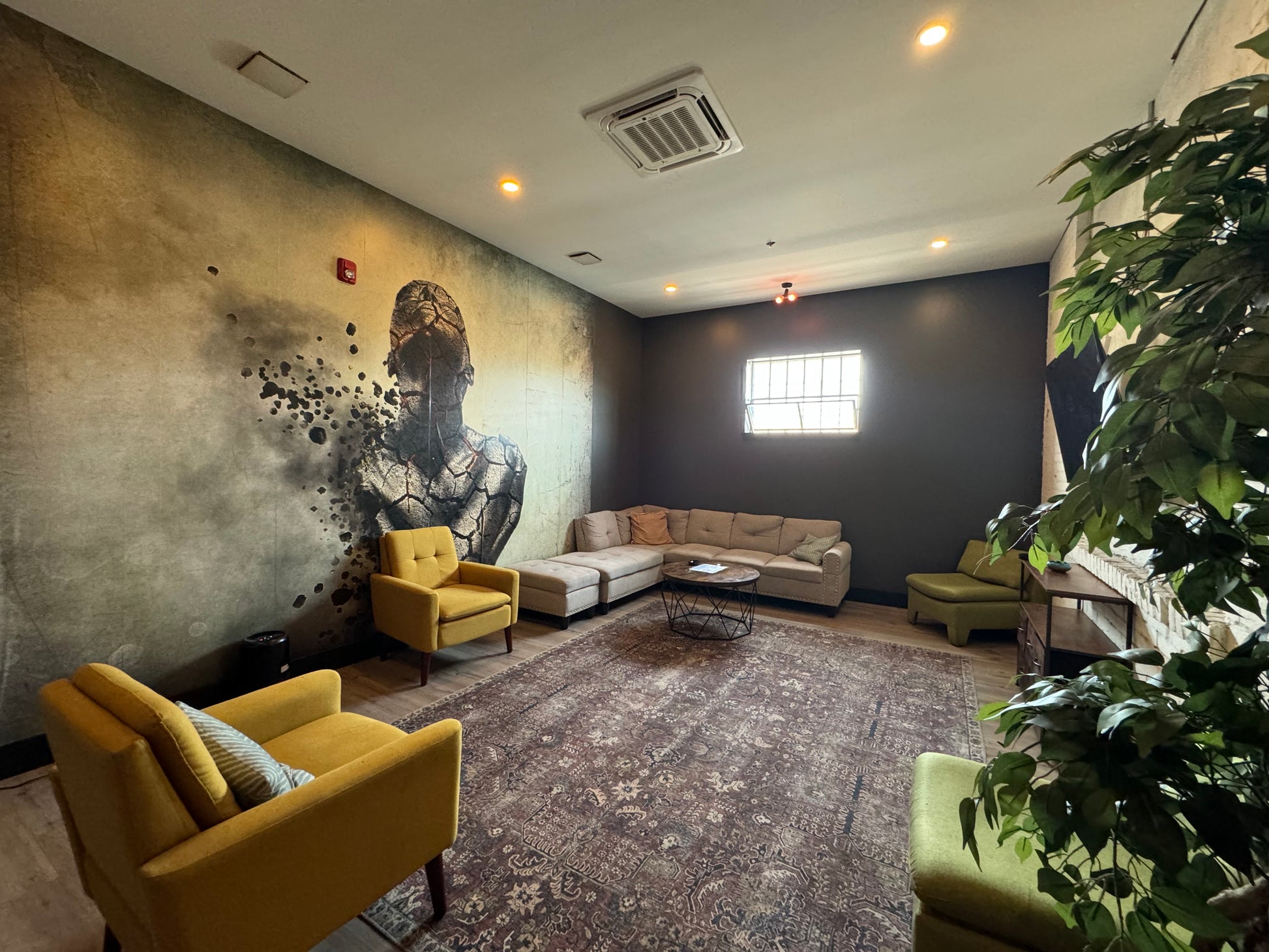 The space includes a fully equipped vocal booth featuring a Neumann TLM 102 microphone, Apollo Twin interface, and PreSonus preamp — ideal for capturing clean, professional recordings. The seating area offers a solid wooden coffee table, two comfortable couches for collaborators or guests, and an environment built for both focus and creative energy.
